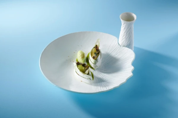 Pour son dessert de sélection, Adrien Salavert a présenté « Entre prairie et verger », une assiette qui associe kiwi, ortie et fromage blanc, sélectionnés auprès de producteurs situés à quelques kilomètres du Restaurant les Belles Perdrix de Troplong Mondot. Surprenant par ses alliances inattendues et ses ingrédients peu communs, ce dessert à la fois équilibré, frais et gourmand a su une nouvelle fois susciter une véritable émotion à la dégustation.