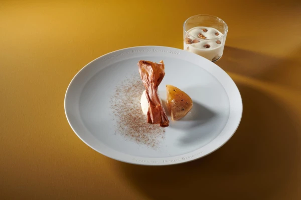 Face au panier imposé, le chef a proposé une poire rôtie au beurre et au miel, accompagnée d’un sorbet poire à la cardamome verte et d’une gavotte au caramel, le tout lié par une sauce à manger associant brunoise de pommes, siphon de sabayon au vin jaune (clin d’œil à la région hôte de l’épreuve) et noix de macadamia caramélisées. Une assiette qui a séduit le jury par sa maitrise et sa créativité, soulignant la justesse des saveurs et l’équilibre des textures.