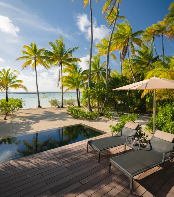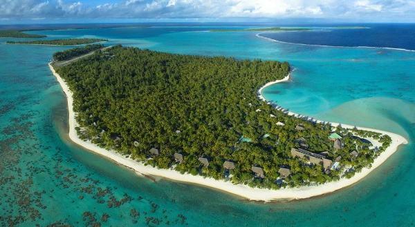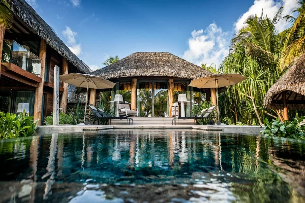 Les villas se fondent dans la végétation, sans dénaturer la silhouette de l’atoll. Ici, point de construction sur pilotis gagnés sur l’eau et un seul motu (ilot en tahitien) est consacré à l’hôtel, les autres restant vierges de toute présence humaine, pour mieux voir s’épanouir la faune et notamment les oiseaux marins. Les matériaux entrant dans la construction et la décoration des bâtiments proviennent de l’archipel polynésien comme le bois ou la palme tressée et sont d’origine certifiée, renouvelables ou recyclés.